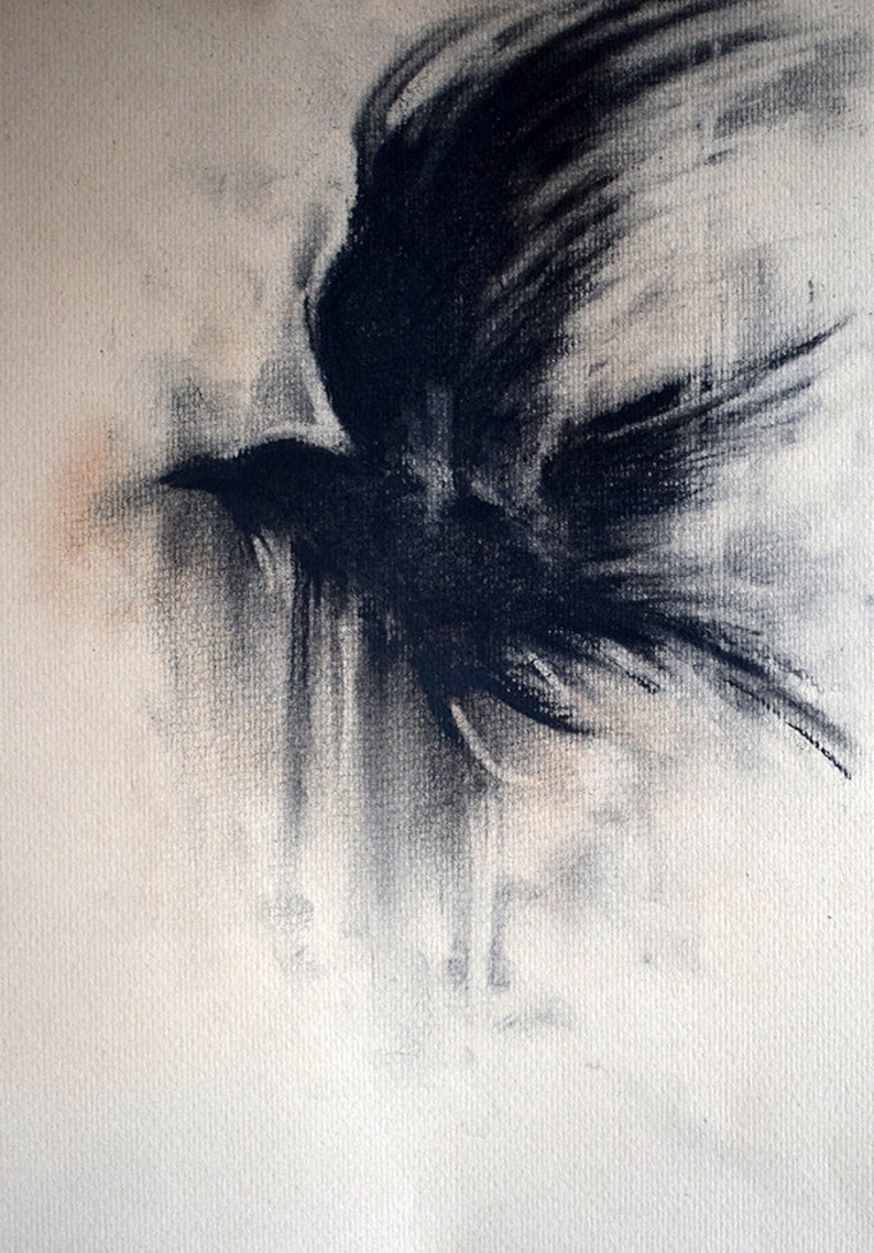 Original Charcoal Drawing Flying Crow Blackbird Dark Art Etsy